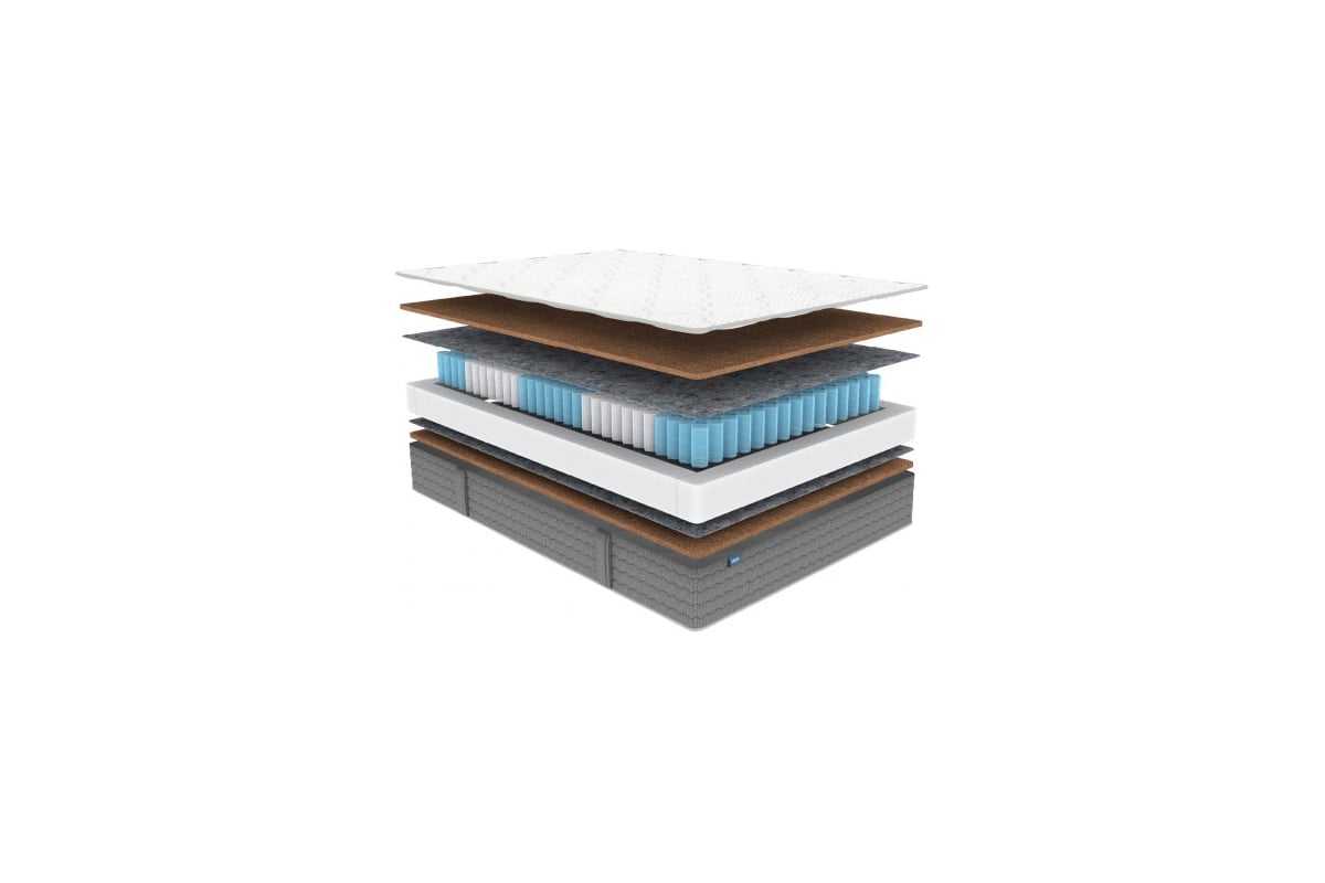 В центре модели установлен специальный пружинный блок, который продолжает и усиливает свойства койры. Каждая из 512 пружин на спальное место работает автономно, это значит, что матрас реагирует точено на приходящий вес и откликается только там, где нагружается зона. Таким образом модель не будет раскачиваться, идти волнами и не получит неприятный «эффект гамака».