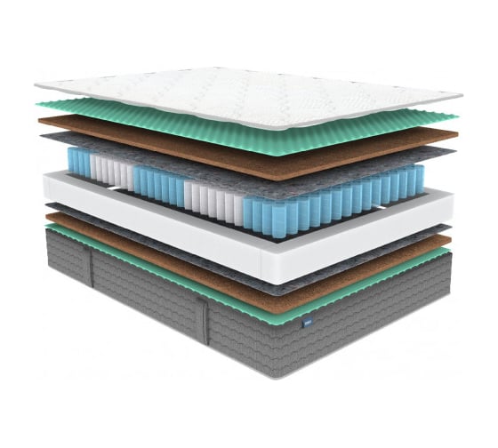 Наполнители: Высокую жёсткость матрас обрёл благодаря присутствию 2 см полотен кокосовой койры. Этот плотный наполнитель получают из растительной основы – кокосового волокна. Чтобы плита была прочной и гибкой её заливают раствором из натурального латекса. В результате материал обретает пластичность при сохранении твёрдости. Эти качества позволяют слою оказывать одну из самых адаптивных ортопедических поддержек для спины. Массажные свойства обеспечивает специальная пена Массаж Фоам. Она изготавливается из пенополиуретановой основы. Её изюминка – это специальная фигурная резка. Поверхности пласта не ровные, а наделены многочисленными выпуклостями. С их помощью слой оказывает массажное воздействие на спящего.