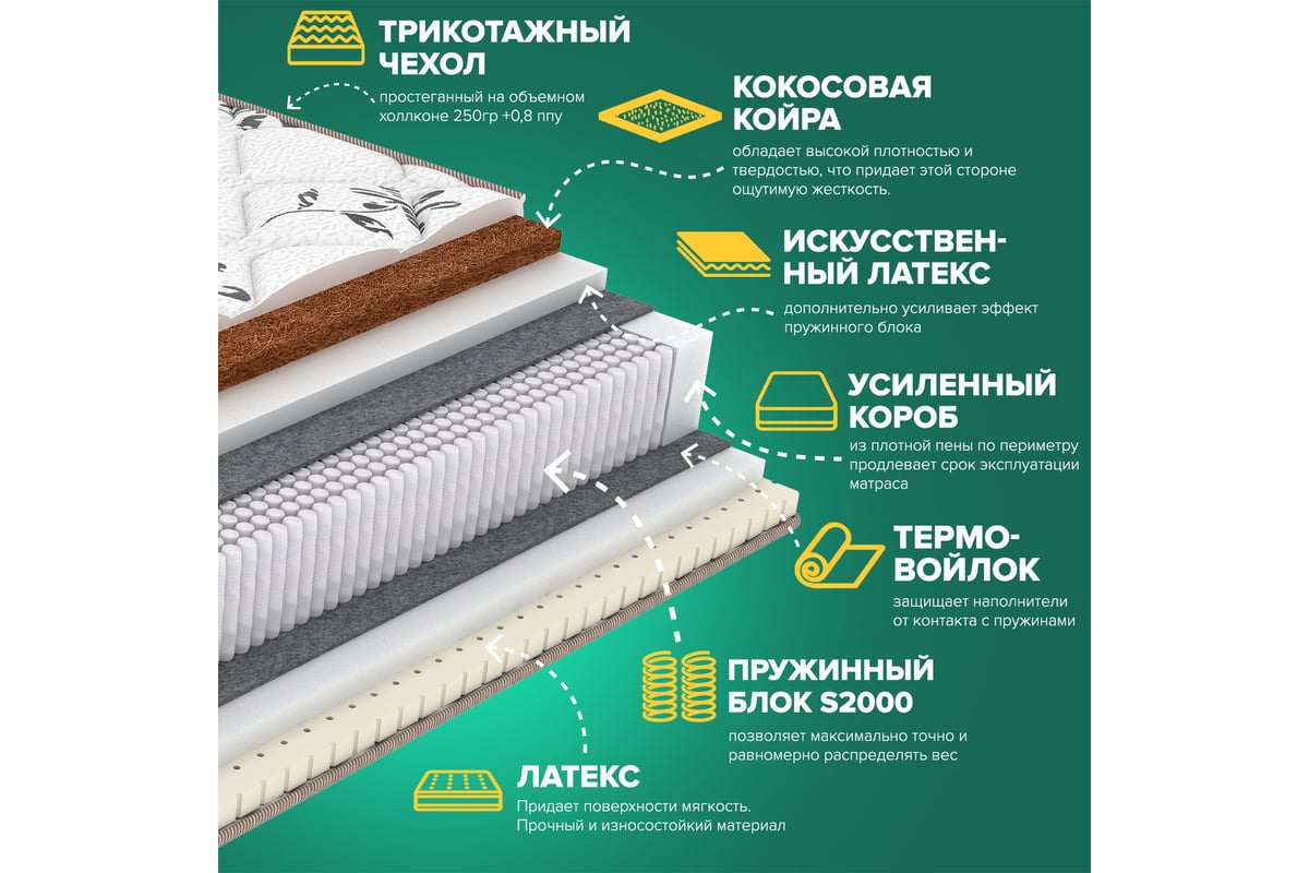 Основой данной модели служит блок пружин независимого типа – S2000. Такой блок дает возможность равномерно распределять нагрузку и помогает матрасу гибко подстраиваться под тело спящего. Блок пружин отделен от наполнителей слоями термовойлока,он защищает наполнители от контакта с пружинами и продлевает срок службы матраса. Характеристики спальных поверхностей у этого матраса различны. Одна сторона – жесткая, в качестве наполнения для нее использованы кокосовая койра и искусственный латекс. Вторая сторона – умеренно мягкая, она представлена комбинацией натурального и искусственного латекса. Блок пружин отделен от наполнителей изолирующими слоями термовойлока. Этот плотный материал защищает наполнители от контакта с пружинами и продлевает срок эксплуатации матраса По периметру матраса предусмотрено усиление из плотной пены, что продлевает срок эксплуатации матраса. Общая высота модели – 23 см. Максимальная нагрузка – 150 кг. Матрас поставляется в трикотажном чехле LUX, простеганном на объемном холлконе 250 грамм + слой ппу 0,8 см. Боковина матраса из мебельной рогожки с объемным наполнителем . Такое сочетание материалов подарит дополнительный комфорт во время сна. Чехол выглядит пышно, роскошно и приобретает неповторимый изысканный внешний вид.