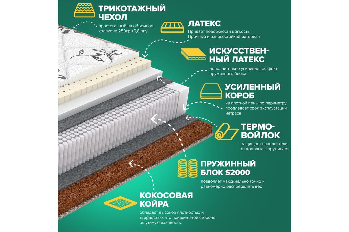 Двусторонняя модель с различной жесткостью сторон – жесткая и умеренно-мягкая. Основой матраса служит блок независимых пружин класса «люкс» S2000. В таком блоке каждая пружина реагирует на прилагаемое усилие индивидуально, и благодаря этому весь матрас гибко подстраивается под контуры тела и вес. Точечная подстройка, в свою очередь, обеспечивает полноценную поддержку и способствует расслаблению.Блок пружин отделен от наполнителей слоями термовойлока,он защищает наполнители от контакта с пружинами и продлевает срок службы матраса. Наполнителями с умеренно-мягкой стороны служат ортопедическая пена и натуральный латекс. Пена представляет собой материал средней жесткости, латекс – чуть более мягкий и упругий. Сочетание этих наполнителей дарит спальной поверхности высокий комфорт. С жесткой стороны использована плита кокосовой койры – жесткого натурального материала, который известен своими ортопедическими свойствами. Оба наполнителя хорошо вентилируются, не накапливают пыль и неприятные запахи. По периметру матраса предусмотрено усиление из плотной пены, что продлевает срок эксплуатации матраса. Общая высота модели – 22 см. Максимальная нагрузка – 150 кг. Матрас поставляется в трикотажном чехле LUX, простеганном на объемном холлконе 250 грамм + слой ппу 0,8 см. Боковина матраса из мебельной рогожки с объемным наполнителем . Такое сочетание материалов подарит дополнительный комфорт во время сна. Чехол выглядит пышно, роскошно и приобретает неповторимый изысканный внешний вид.