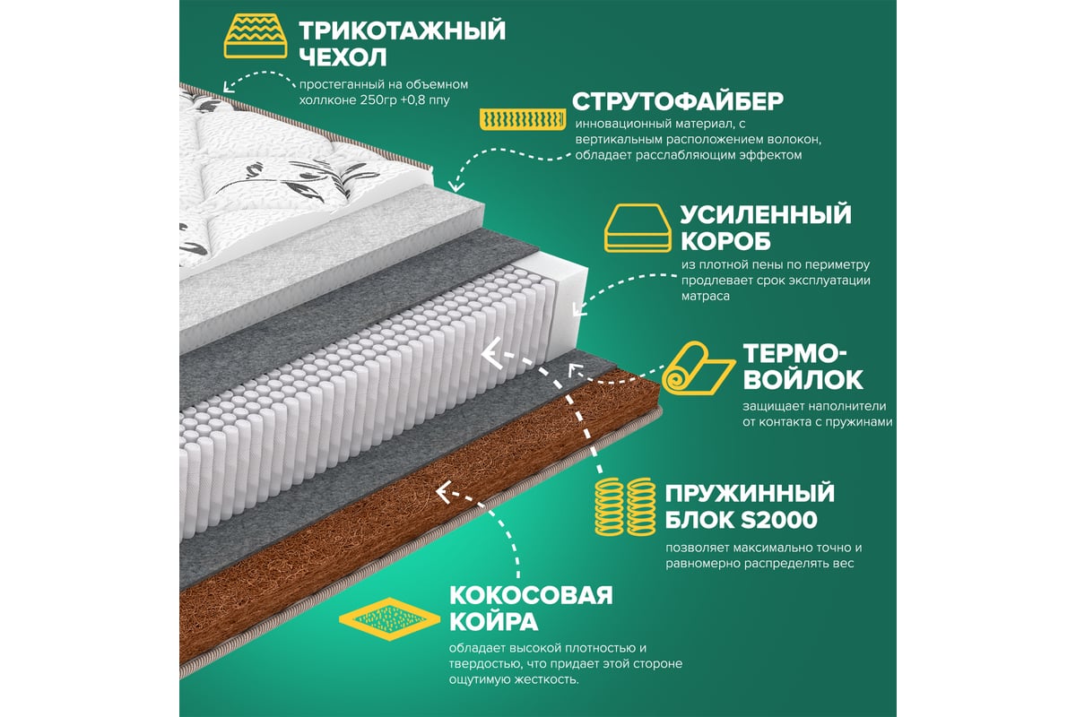 Ортопедический матрас имеет разную жесткость сторон. Основа данной модели – блок независимых пружин S2000. Плотность пружин в таком блоке составляет 2000 штук в расчете на спальное место, что обеспечивает максимально точную подстройку под контуры тела и вес. Каждая пружина, кроме того, находится в своем чехле из ткани, что позволяет им реагировать на прилагаемое усилие независимо. А правильное распределение нагрузки, в свою очередь, придает матрасу хорошие ортопедические свойства.Блок пружин отделен от наполнителей изолирующими слоями термовойлока. Сторона средней жесткости представлена наполнителем Струттофайбер. Это инновационный материал, с вертикальным расположением волокон , по своим свойствам напоминает работу пружинного блока.Струттофайбер обладает расслабляющим эффектом и усиливает ортопедические свойства спальной поверхности. Жесткая сторона представлена койрой кокоса, придающая этой спальной поверхности высокую плотность и твердость. Сон на таком матрасе гарантирует полноценное расслабление, снятие напряжения и легкое пробуждение по утрам. Оба материала хорошо вентилируются, не задерживают влагу, пыль и неприятные запахи. По периметру матраса предусмотрено усиление из плотной пены, что продлевает срок эксплуатации матраса. Общая высота модели – 21 см. Максимальная нагрузка – 150 кг. Матрас поставляется в трикотажном чехле LUX, простеганном на объемном холлконе 250 грамм + слой ппу 0,8 см