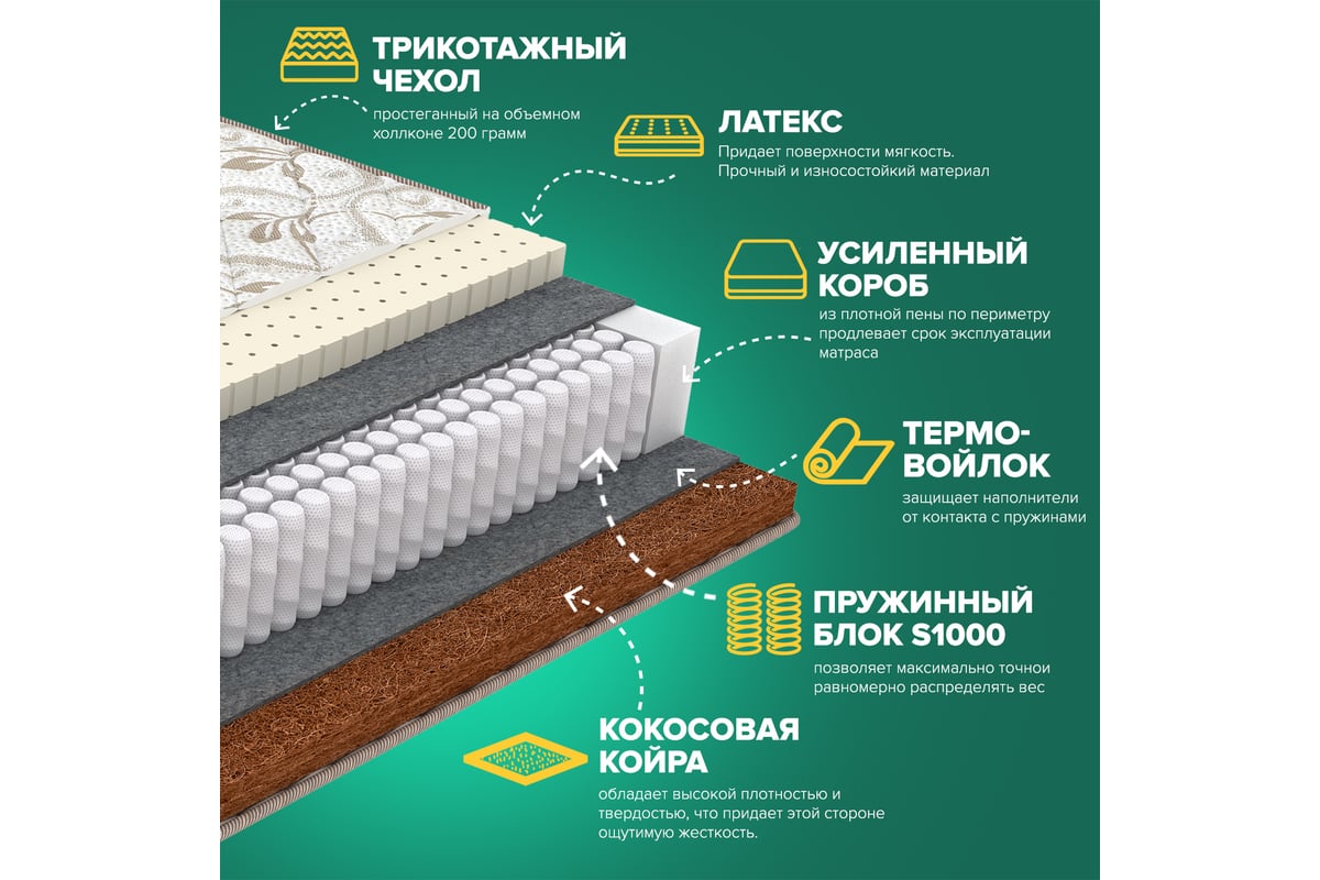 Ортопедический матрас с различной жесткостью поверхностей – жесткая и мягкая. В основе модели лежит блок пружин независимого типа S1000, который содержит 1000 пружинок в расчете на спальное место. Блок позволяет равномерно распределять нагрузку и поддерживать позвоночник в течение всего времени сна.По обеим сторонам блока находятся слои термовойлока, защищающего наполнители от контакта с пружинами и продлевающего срок службы матраса. Наполнителями в этой модели служат исключительно натуральные, гипоаллергенные материалы – койра кокоса и латекс. С более мягкой стороны находится упругий слой латекса, придающий этой поверхности комфортность. С жесткой стороны использована койра, обеспечивающая твердость и усиливающая ортопедические свойства пружинного блока. Оба наполнителя хорошо вентилируются, не накапливают влагу, пыль и посторонние запахи. По периметру матраса предусмотрено усиление из плотной пены, что продлевает срок эксплуатации матраса. Общая высота модели – 21 см. Максимальная нагрузка – 140 кг. Матрас поставляется в трикотажном чехле, простеганном на объемном холлконе 200 грамм особенность холлкона в том, что его волокна расположены вертикально,это придаёт дополнительный комфорт и упругость .Такой чехол выглядит более пышно и роскошно в отличие от обычных синтепоновых аналогов.