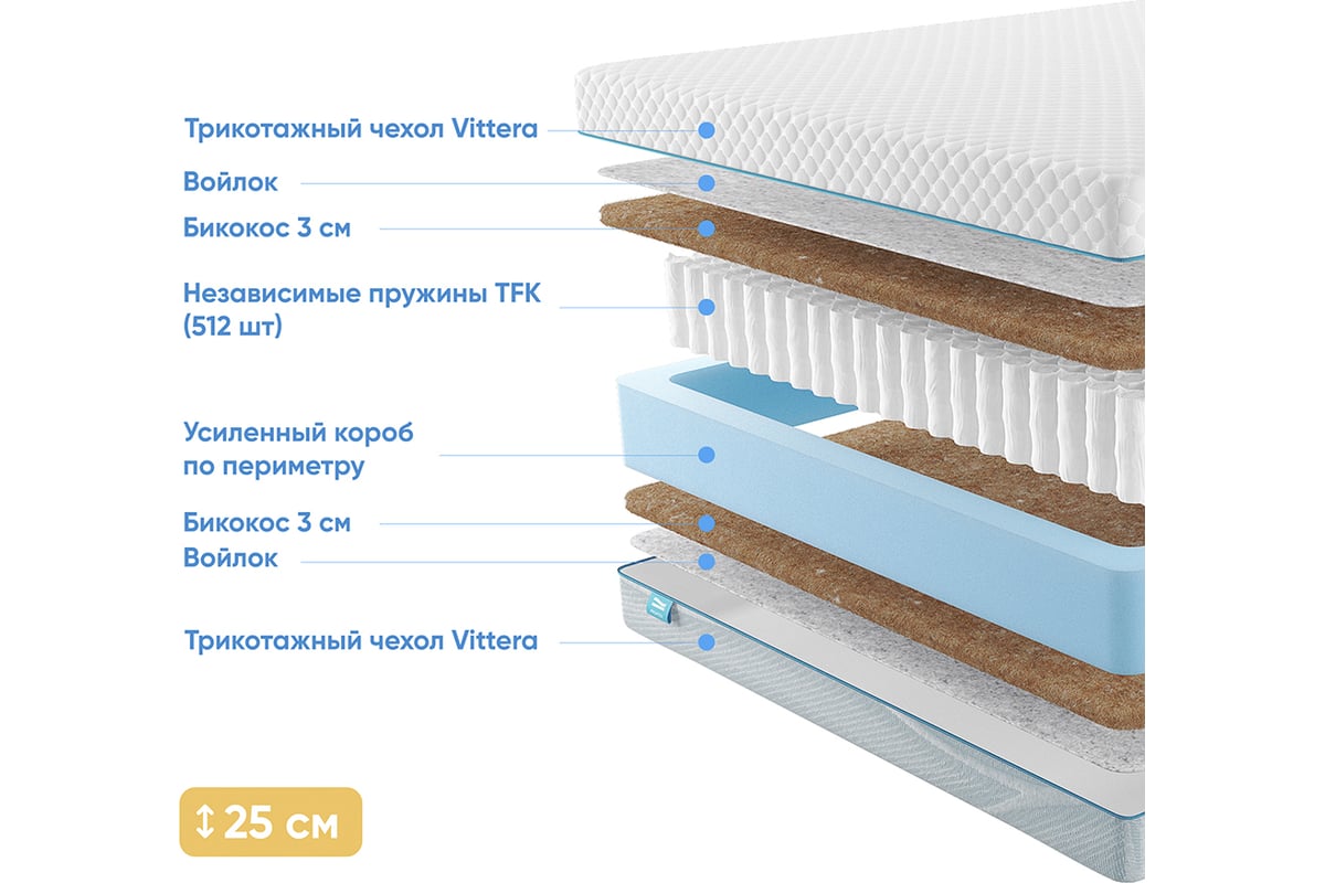 Модель Soft 18 Bicocos - анатомический чехловой матрас от бренда Promtex. Матрас имеет съемный чехол на молнии. Ткань чехла отлично дышит, она мягкая и хлопковая на ощупь. Съемный чехол легко снимается и надевается, что дает возможность стирки в домашних условиях. У матраса Soft 18 Bicocos расположен блок независимых пружин. Тип пружинного блока TFK. Изделия с пружинным блоком TFK подойдут парам, в которых разница в весе партнеров не превышает 20 кг, и людям с весом до 100 кг. Количество пружин на спальное место: 500 шт. Нагрузка на спальное место составляет 125 кг. Высота модели: 24 см. В данной модели используются следующие материалы: Трикотаж Vittera, Войлок, Бикокос, ПБ TFK, Бикокос, Войлок, Трикотаж Vittera. Войлок - плотный материал из натуральных и искусственных волокон, который часто используется в пружинных моделях для защиты материалов наполнителей и чехла изделия. Бикокос - жесткий, прочный, гипоаллергенный материал. Он отлично подойдет тем, кому нужна особенная поддержка позвоночника - людям, страдающим от проблем со спиной и детям до 12 лет. Бикокос в жесткости не уступает натуральному материалу, а в прочности даже превосходит его. Чехол в модели Soft 18 Bicocos изготовлен из материала Трикотаж. Модель Soft 18 Bicocos имеет 2 одинаковые стороны жесткости. Степень жесткости модели Soft 18 Bicocos с обеих сторон: Жесткий. Гарантийный срок - 1.5 года. Срок службы составляет 15 лет.