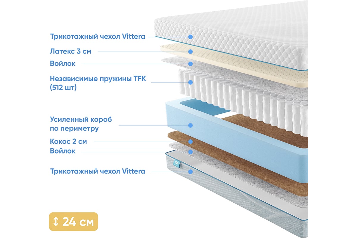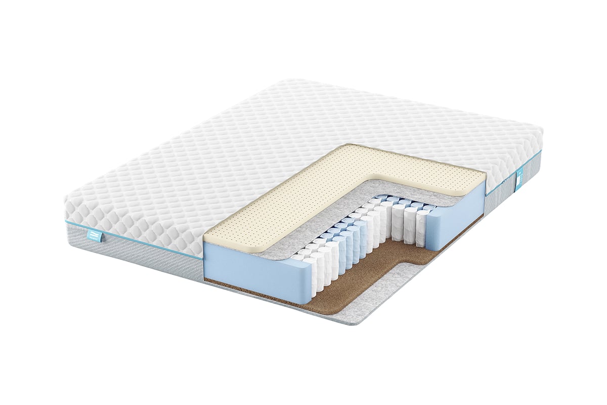 Модель Soft 18 Combi - анатомический чехловой матрас от бренда Promtex. Матрас имеет съемный чехол на молнии. Ткань чехла отлично дышит, она мягкая и хлопковая на ощупь. Съемный чехол легко снимается и надевается, что дает возможность стирки в домашних условиях. У матраса Soft 18 Combi расположен блок независимых пружин. Тип пружинного блока TFK. Изделия с пружинным блоком TFK подойдут парам, в которых разница в весе партнеров не превышает 20 кг, и людям с весом до 100 кг. Количество пружин на спальное место: 500 шт. Нагрузка на спальное место составляет 125 кг. Высота матраса: 23 см. В данной модели используются следующие материалы: Трикотаж Vittera, Латекс, Войлок, ПБ TFK, Кокос, Войлок, Трикотаж Vittera. Кокосовая койра - натуральный износостойкий материал, отличающийся высокой жесткостью и упругостью. Натуральный латекс - высокоэластичный и прочный материал, который подстраивается под изгибы вашего тела. Материал быстро восстанавливается, не подвержен деформации, не впитывает влагу и не вызывает аллергии. Войлок - плотный материал из натуральных и искусственных волокон, который часто используется в пружинных моделях для защиты материалов наполнителей и чехла изделия. Чехол в модели Soft 18 Combi изготовлен из материала Трикотаж. Данная модель матраса имеет сразу 2 стороны жесткости: Средний и Жесткий. Гарантийный срок: 1.5 года. Срок службы составляет 15 лет.