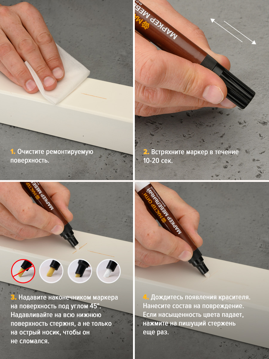 - Для подкрашивания краев крупных повреждений (сколы, трещины) перед нанесением реставрационных материалов Мастер Сити (карандаш, воски, паста реставрационная, штрих мебельный)