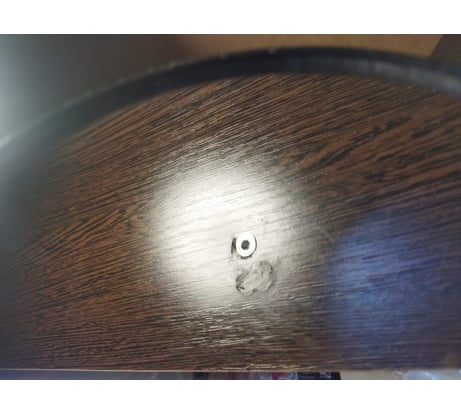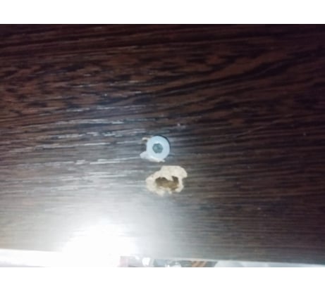 В общем, решил я его опробовать на глубоком (сквозном) отверстии, расположенному в неудобном месте (на горизонтальной полке с нижней стороны на высоте 60 см от пола). Отмечу, что по инструкции сказано сначала подкрасить края повреждения мебельным маркером, но у меня его нет, поэтому сразу вмазывал воск, а потом подкрасил мебельным штрихом. Хоть этот воск и заявлен как "мягкий", резал его канцелярским ножом (нужен был кусок большой), а втирать шпателем не представлялось возможным. Прижимал к отверстию обрезком ЛДСП, который прижимал, в свою очередь, стубциной. Излишки срезал тоже канцелярским ножом. Результат на фото (удовлетворительный для места, которое не на виду). В принципе, если бы повреждение было на вертикальной поверхности или на горизонтальной, но сверху, можно было бы достичь хорошего результата.