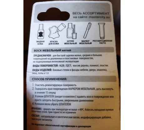 Мебельный воск (карандаш) предназначен для ремонта повреждений на мебели, окнах, дверях, напольных покрытиях. Применяйте воск на изделиях из ЛДСП, МДФ, массива дерева, пластика. Воск для мебели улучшает внешний вид мебели, скрывает недостатки, сливается с поверхностью, удобно применять в домашних условиях. Воск мебельный (восковой мелок) легко втирается, прочно и надолго закрепляется в повреждении, устойчив к деформации, не дает усадки и не выцветает со временем. В местах, подверженных динамическим нагрузкам (напольные покрытия, столешницы), дополнительно защитите место реставрации от загрязнения и деформации Лаком быстросохнущим Мастер Сити. Воск для ремонта мебели (восковой мелок) полностью готов к применению, в комплект входит шпатель. Следуйте инструкции на упаковке.