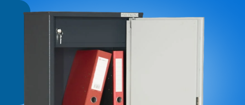 Толщина корпуса и двери шкафа 1 мм. Шкаф односекционный, оснащен съемной полкой и трейзером. В двери установлен ключевой сувальдный замок.