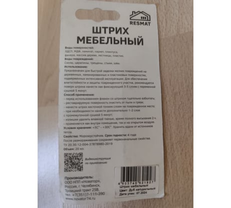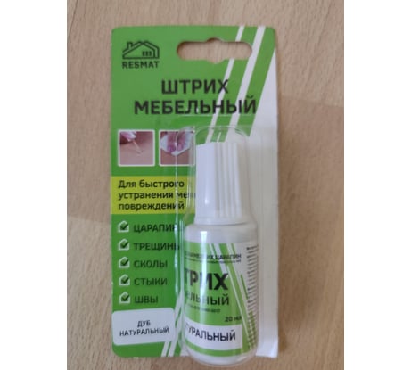 Мебельный штрих Resmat цвет дуб натуральный, блистер арт. 2192 предназначен для быстрой заделки мелких повреждений на деревянных, ламинированных и пластиковых поверхностях, подверженных интенсивной эксплуатации. Для обеспечения влагостойкости и защиты поврежденного участка, рекомендуется поверх штриха нанести лак фиксирующий 3-5 слоев с переменной сушкой 5 минут.