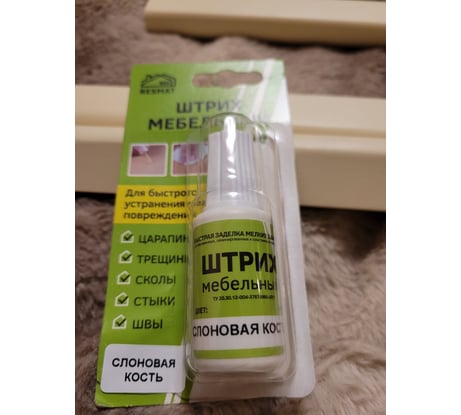 Мебельный штрих Resmat цвет слоновая кость, блистер арт. 2188 предназначен для быстрой заделки мелких повреждений на деревянных, ламинированных и пластиковых поверхностях, подверженных интенсивной эксплуатации. Для обеспечения влагостойкости и защиты поврежденного участка, рекомендуется поверх штриха нанести лак фиксирующий 3-5 слоев с переменной сушкой 5 минут.
