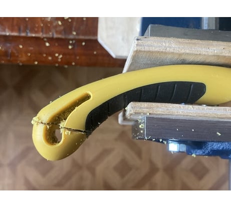 Скобоудалитель сразу на выброс или заточку. Не смазано почти нигде. Маленький плевок смазки только на пружине нашёлся. Неудивительно, что ломается после 2000 скоб у кого-то. Боёк с полукруглым вырезом на мягком дереве выгибает скобу небольшой дугой, на фанере нормально. Ручка шатается, на оси нет шайб внутри, как и смазки. Ложемент лишний - зачем держать пружину во взведённом состоянии?