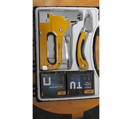 Строительный мебельный степлер DELI металлический с регулировкой + антистеплер DL238105 с набором скоб в кейсе (Тип «П» 4-14мм, «U» 10-12мм и «T» 10-14мм по 2000шт каждых) 98418 - это мощный и надежный инструмент, который используется в строительстве и ремонте для крепления различных материалов, таких как дерево, ткань, пластик и многие другие. Он обеспечивает быстрое и прочное крепление, и является неотъемлемым инструментом для строительных и отделочных работ.