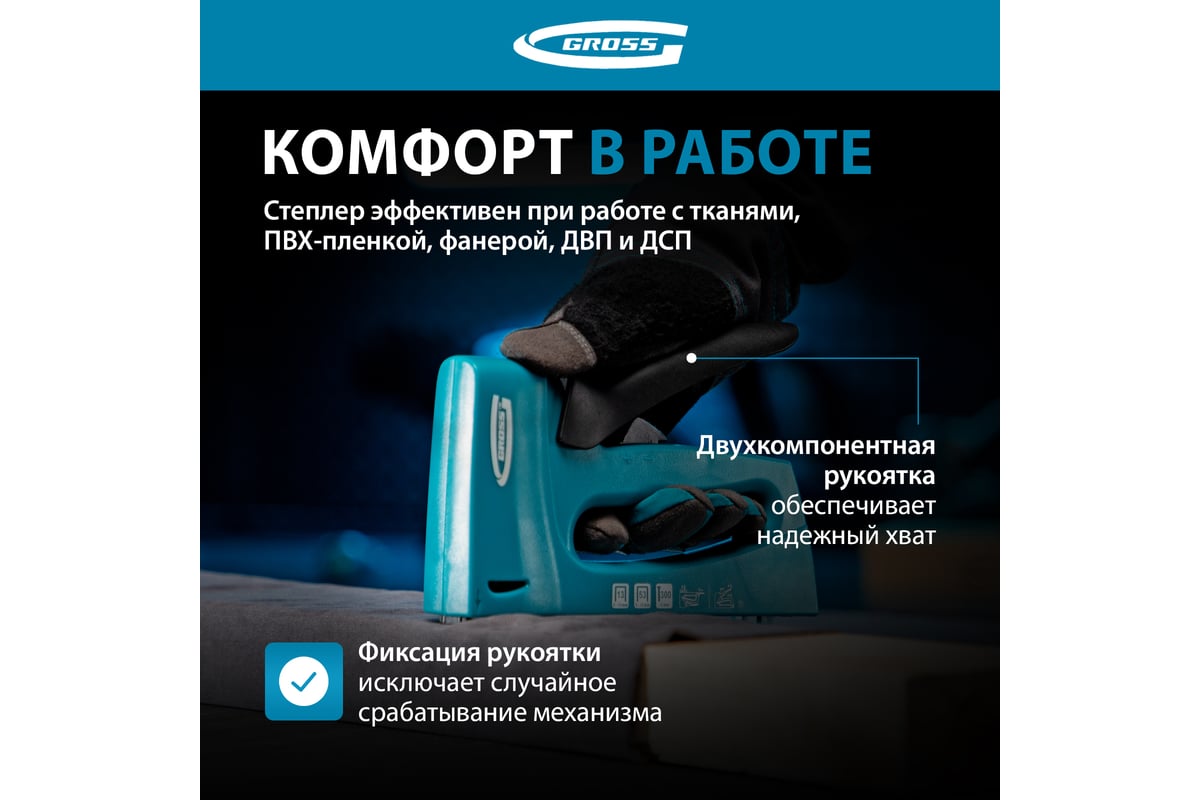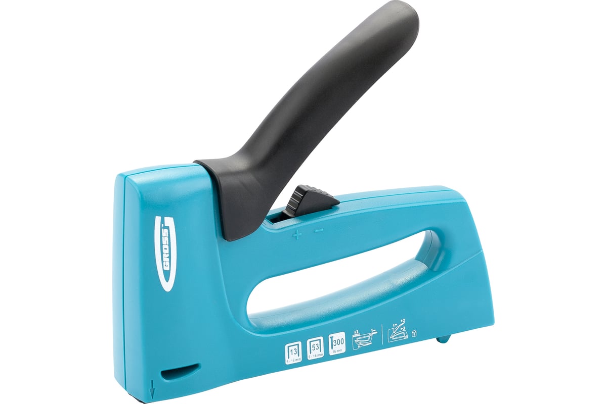 Мебельный степлер Gross 41003 в пластиковом корпусе, с функцией регулировки силы удара, совместим со скобами типа 13, 53 размером 6-16 мм и гвоздями типа 300 размером 16 мм. Его используют для быстрого крепления на деревянном основании фанеры, оргалита, ДВП, ДСП, пленки, утеплителя и других листовых материалов. Корпус устойчив к повреждениям, поскольку отлит из ударопрочного пластика. Двухпозиционный переключатель позволяет регулировать силу удара в зависимости от длины скоб и твердости материала. Действия в труднодоступных местах облегчает длинный тонкий носик. Инструмент идеально сбалансирован, что сводит отдачу к минимуму. Степлер пригодится при сборке и обшивке мебели, укладке ковровых покрытий и изоляционных материалов, выполнении багетных работ. Подходит для профессионального применения.