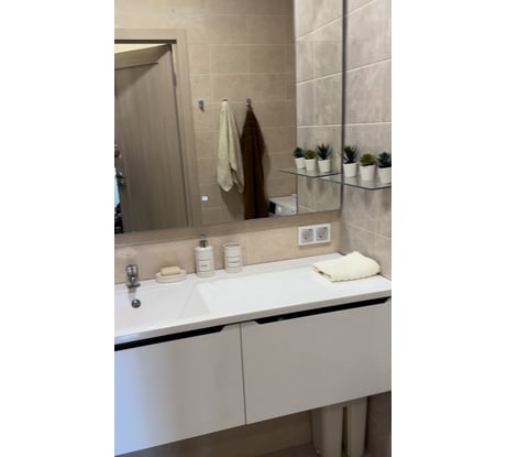 Широкая столешница, большой размер самой раковины. Смотреть и пользоваться - одно удовольствие! Брали к ней тумбу с ящиками, очень удобно хранить бытовую химию и косметические принадлежности. Однозначно рекомендую 👍