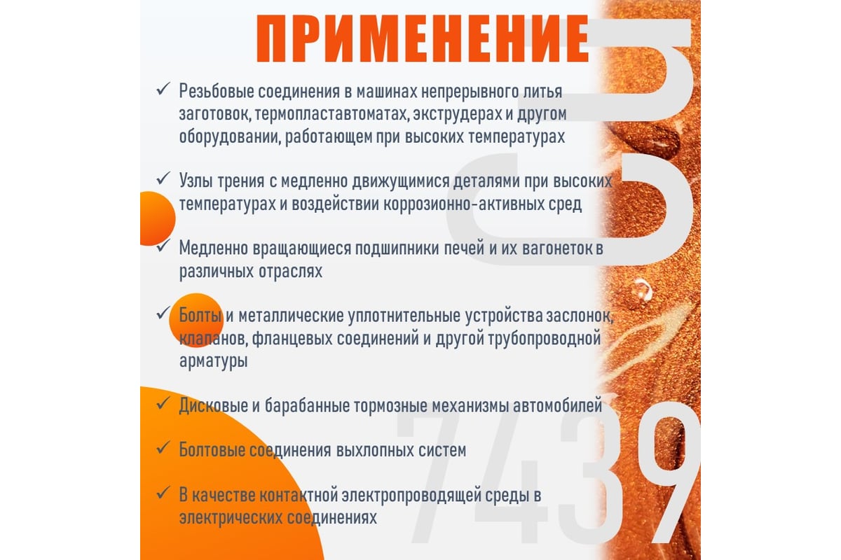 Паста медная «РУСМА Cu-7439» – премиальная высокотемпературная влагостойкая смазка с ингибитором коррозии. Рекомендуется для узлов трения металл-металл нуждающихся в защите от воды, пара и коррозии, например, тормозные механизмы, фланцевые уплотнители, болты выхлопных систем. Содержит в своём составе смесь минеральных и синтетических базовых масел, загущённых комплексным кальциевым мылом, пакет адгезионных и антикоррозийных присадок. Смазка не содержит в своём составе свинца и цинка. Смазка отличаются водостойкостью, структурной стабильностью, высокой адгезией, в том числе во влажной среде. Диапазон рабочих температур составляет от –30 до +300 ºC, за счёт температурной устойчивости твёрдых составляющих смазки до +650ºC.