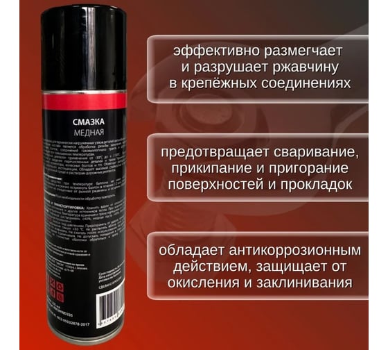 Медная смазка для термически нагруженных узлов деталей автомобилей. Основным назначением состава является обработка резьбы зажигания, направляющих тормозных болтов, соединений газовыхлопного тракта и других деталей, работающих при повышенных температурах.