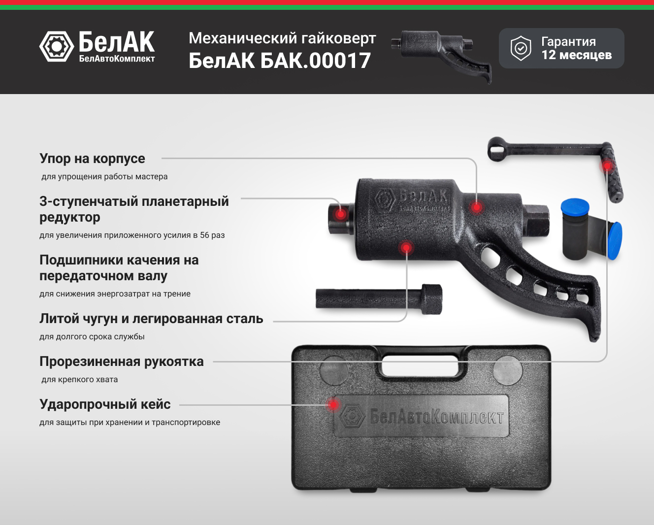 Механический гайковерт 32х33 БелАК БАК.00017 с набором головок обладает светоотражающим пыльником, который защищает от попадания грязевых частиц в механизм редуктора гайковерта. Фирменный логотип на корпусе, выполненный на этапе отливки, защищает от подделок и является гарантом оригинальности изделия. Индивидуальная упаковка головок (индивидуальный пакет + крышка с логотипом) защищает их от коррозии. Передаточное число: 1:56, то есть приложенное усилие будет увеличено в 56 раз. В механизме редуктора гайковерта использованы подшипники, а не втулки скольжения, как у аналогов. Все головки для гайковертов «БелАК» являются ударными.