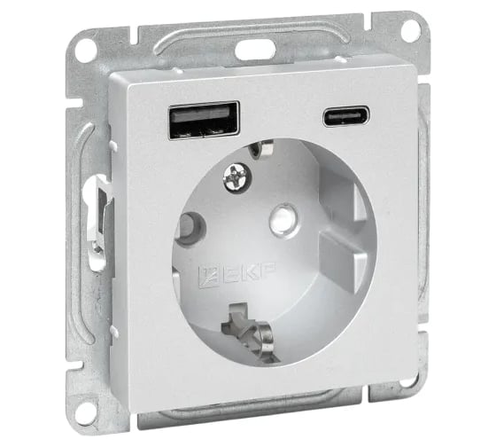 Механизм розетки EKF с USB-A+С - 2шт, 16А, с заземлением, со шторками, алюминий Эпика UP1-SOA-111-USBA+USBC