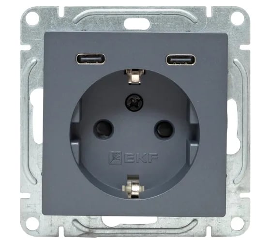 Механизм розетки EKF с USB-C - 2шт, 16А, с заземлением, со шторками, графит, Эпика UP1-SOG-111-2USBC