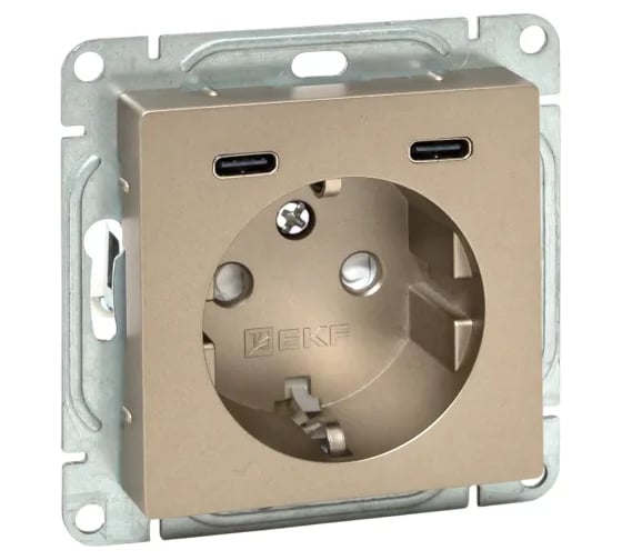 Механизм розетки EKF с USB-C - 2шт, 16А, с заземлением, со шторками, шампань, Эпика UP1-SOC-111-2USBC