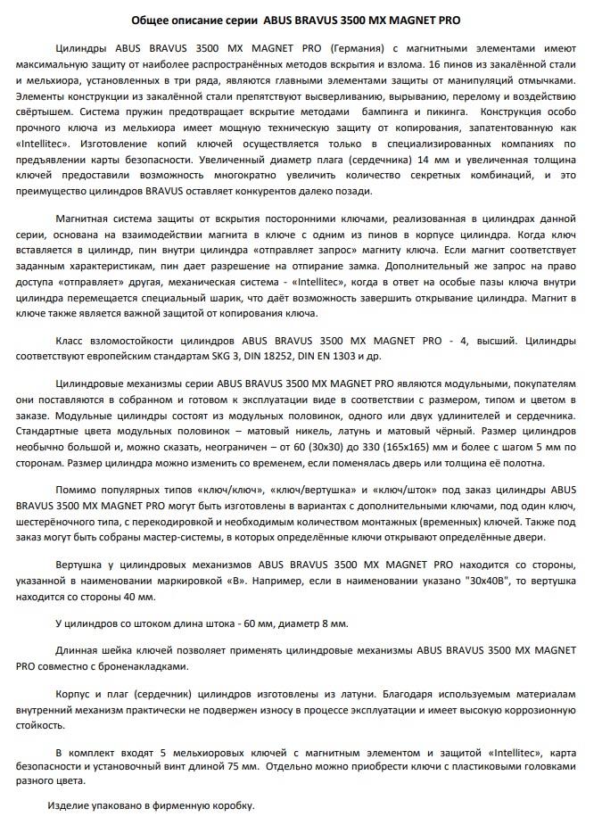 Цилиндровый механизм ABUS BRAVUS 3500 MAGNET MX PRO – это продукт высшего качества от немецкой компании ABUS, который обеспечивает максимальную защищенность от всех известных методов взлома и вскрытия. Особенности цилиндрового механизма: • 16 пинов из закаленной стали и мельхиора обеспечивают защиту от манипуляций отмычками; • элементы из закаленной стали препятствуют взлому путём высверливания, перелома, вырывания и воздействия свертышем; • система пружин предотвращает от взлома методами бампинга и пикинга; • увеличенный диаметр плага и толщина ключей увеличивают количество комбинаций секретных кодов; • две дополнительные системы защиты: магнитная и механическая INTELLITEC; • ключи изготовлены из прочного сплава нейзильбера, что обеспечивает их высокую прочность и износостойкость; • магнит в ключе служит дополнительной защитой от дублирования ключей. • личинка данной серии является модульной, и при замене двери можно изменить размер личинки, обратившись к дилерам; • взломостойкость изделия в России сертифицирована по высшему 4 классу; • личинку можно эксплуатировать во всех климатических зонах России; Цилиндровый механизм ABUS BRAVUS 3500 MAGNET MX PRO является надежным и эффективным средством защиты вашего дома от несанкционированного доступа. Он идеально подходит для тех, кто хочет обеспечить максимальную безопасность и спокойствие для себя и своей семьи. Долговечная личинка с возможностью изменять её размер – отличная инвестиция в семейное благополучие!