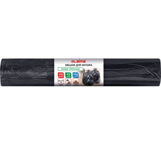 Мешки для мусора LAIMA 160л черные в рулоне 10 штук особо прочные, ПВД 70 мкм, 90x110см 702675