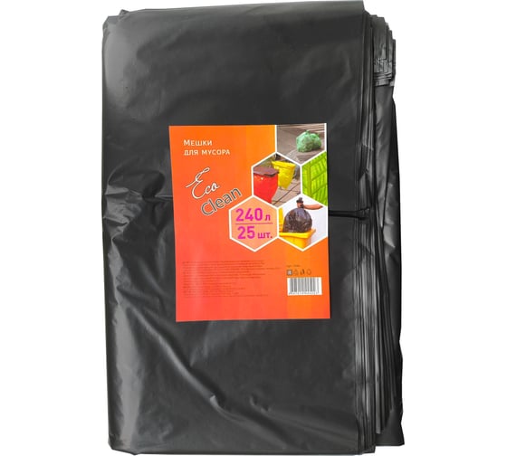 Мешки для мусора Ecoclean 240 л. 25 шт в пластах из вторичного ПВД (30 мкм, черные, 88х106 см). Предназначены для уборки объемного мусора и упаковки крупногабаритных предметов. Незаменимы при уборке строительного мусора, благоустройстве городских территорий, в быту (ремонт, дача, уборка).