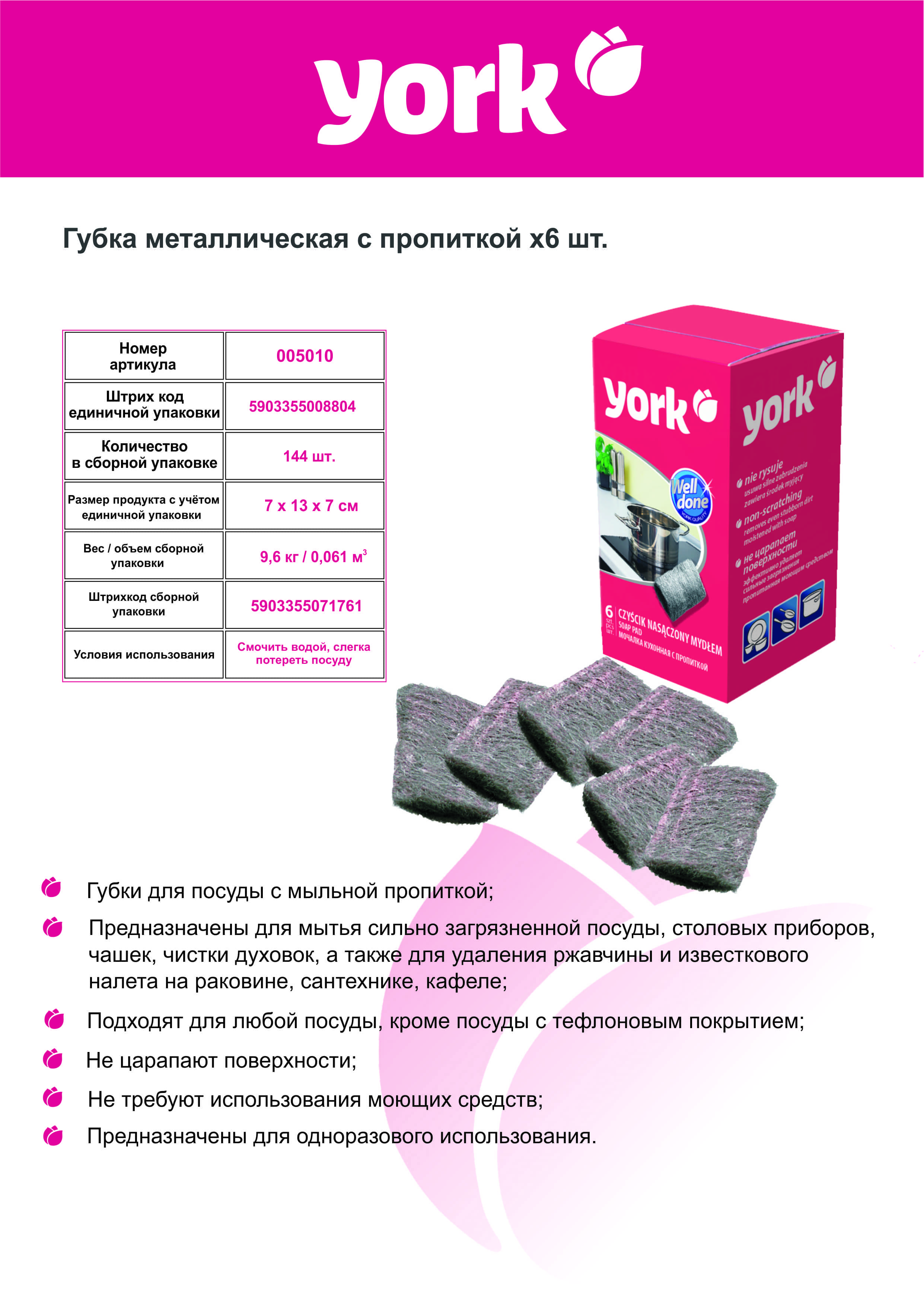 Металлическая губка YORK с пропиткой, 6 шт. 005010 предназначена для удаления загрязнений.