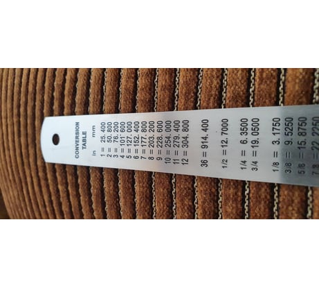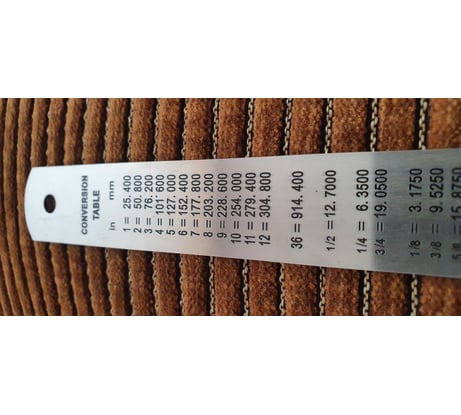 Толщина металла реально 1 мм. Проверено штангенциркулем. Но в сравнении с другой линейкой аналогичной толщины - эта более жесткая. Видимо про stainless hardened упоминание на линейке не зря. Таблица переводов на обратной стороне.. Крайне редко, но иногда требовалась, теперь под рукой. Там же есть таблица диаметров под нарезку резьбы.