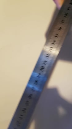 Нержавейка, толщина 1 мм; гравировка шалы; полумиллиметровая разметка только на одной кромке в пределах 100 мм, а не на двух или всю длину; отсутствие заусениц и избыточно острых граней. Сравнивал мерную