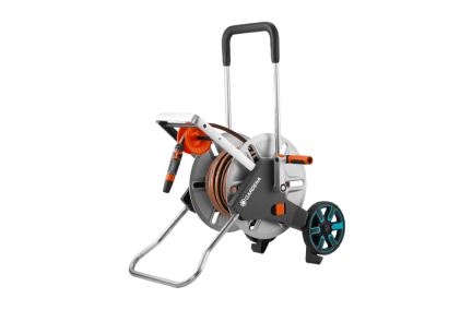 - Ставьте уверенно В основании конструкции предусмотрена П-образная скоба для устойчивости тележки даже при вытягивании шланга