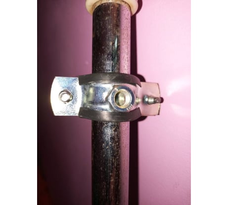 Обычный оцинкованный хомут, держать начинает с 32 мм. Дюбель 10*50, шуруп М8 под ключ 6 мм, винты М5*12.