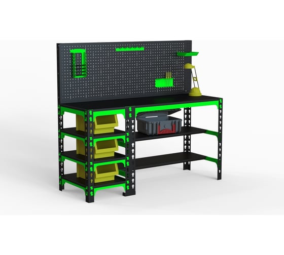 Конструкция имеет прочные опоры из углового профиля. Специальная перфорация позволяет изменить высоту полок. Столешница выполнена из прочного листового металла и выдерживает значительные нагрузки.