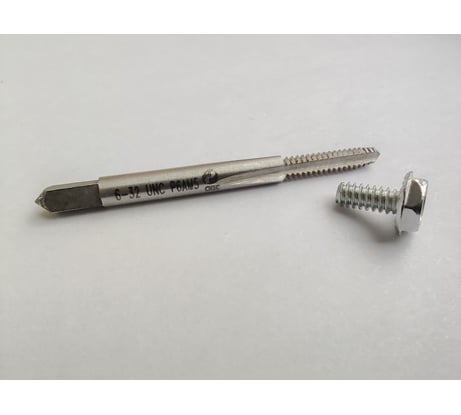 Метчик CNIC № 6 UNC 60гр Р6АМ5 дюймовый, м/р., 32 нитки/дюйм для глухих отверстий 56422. Брал за 350 рЭ для компьютерных винтиков. В общем и целом пойдёт. Хотелось бы такое же, но с перла... с ценой ниже, но не нашёл. После нарезания резьбы винт вкручивается и выкручивается с небольшим люфтом, закручивать так, чтобы узнать сорвётся ли резьба не стал, такой затяжки не нужно.