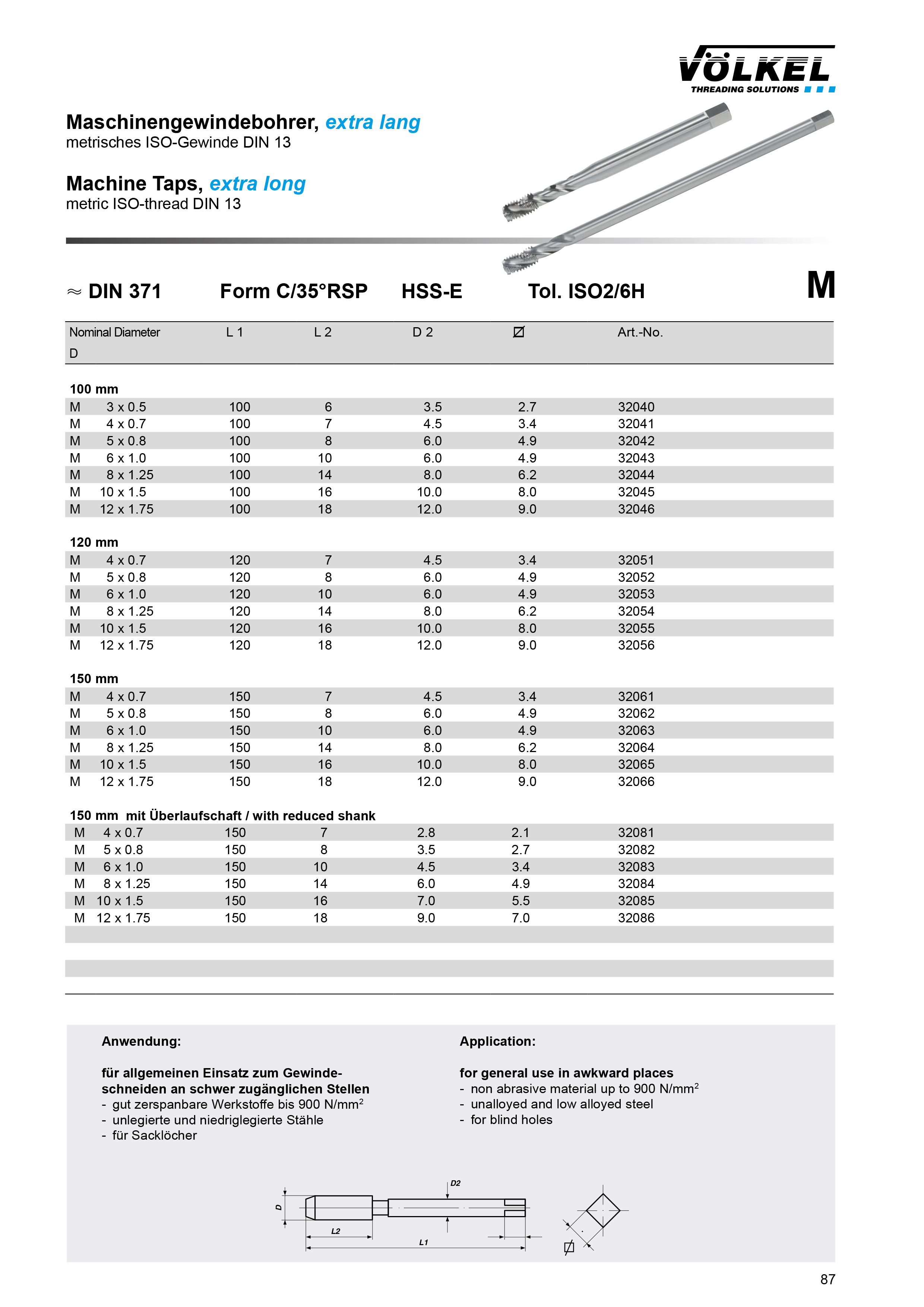 Машинный метчик Voelkel длинный, М12 шаг 1.75мм HSSE 150 мм DIN371XL V32066