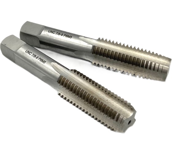Метчик TORNERI UNC 7/8" 9 нитей Р6М5 комплект из 2-х штук 035376 с крупным шагом исполнения резьбы предназначен для нарезания глухих и сквозных внутренних резьб в заготовках из углеродистой, конструкционной, легированной сталей прочностью до 800 МПа, из цветных металлов.