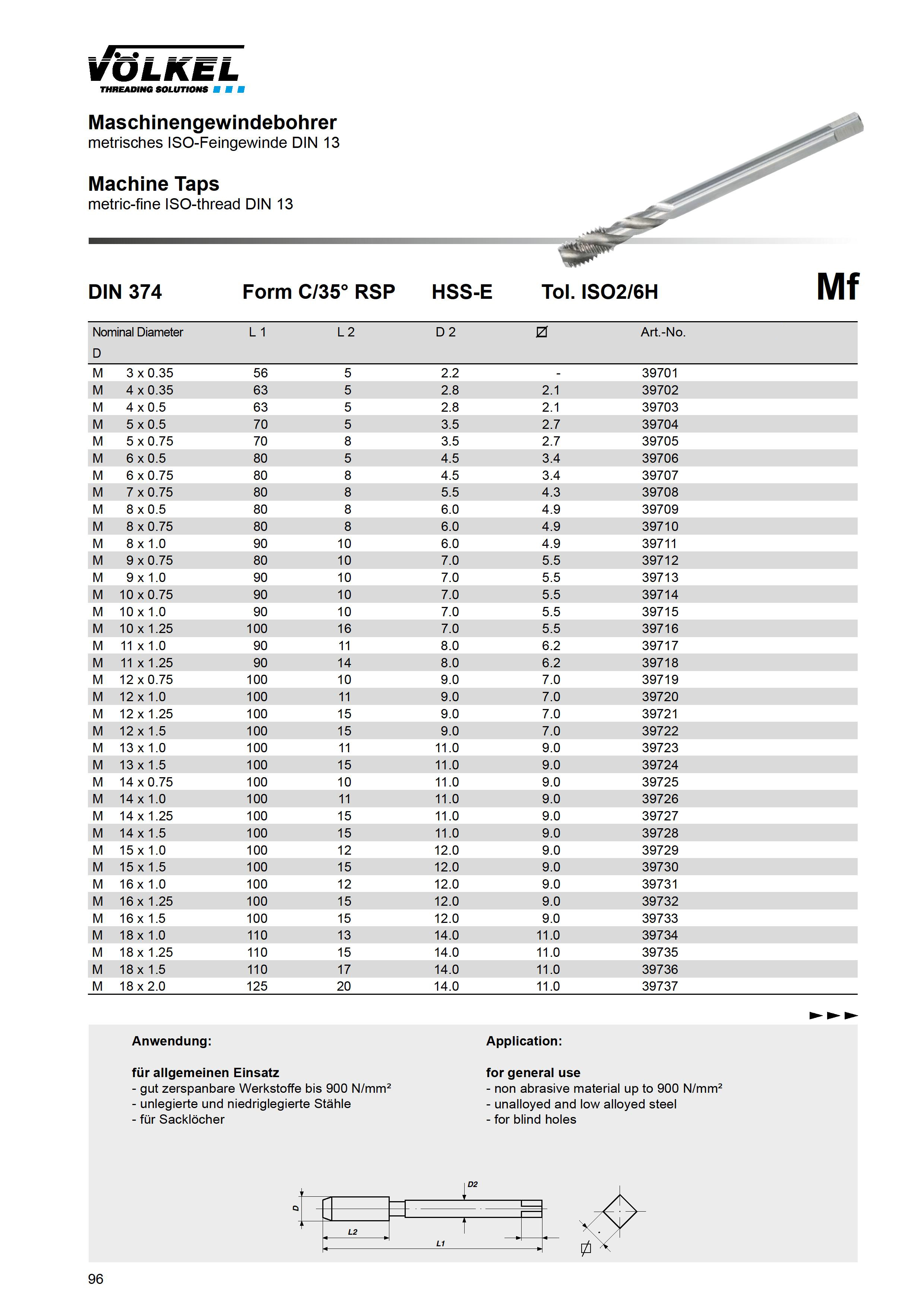 Подходит для обработки заготовок, выполненных из легированной или нержавеющей стали, чугуна, алюминия, меди, бронзы, цинка, с пределом прочности до 900MPa. Форма заборной части C (2-3 нитки) - для глухих отверстий.