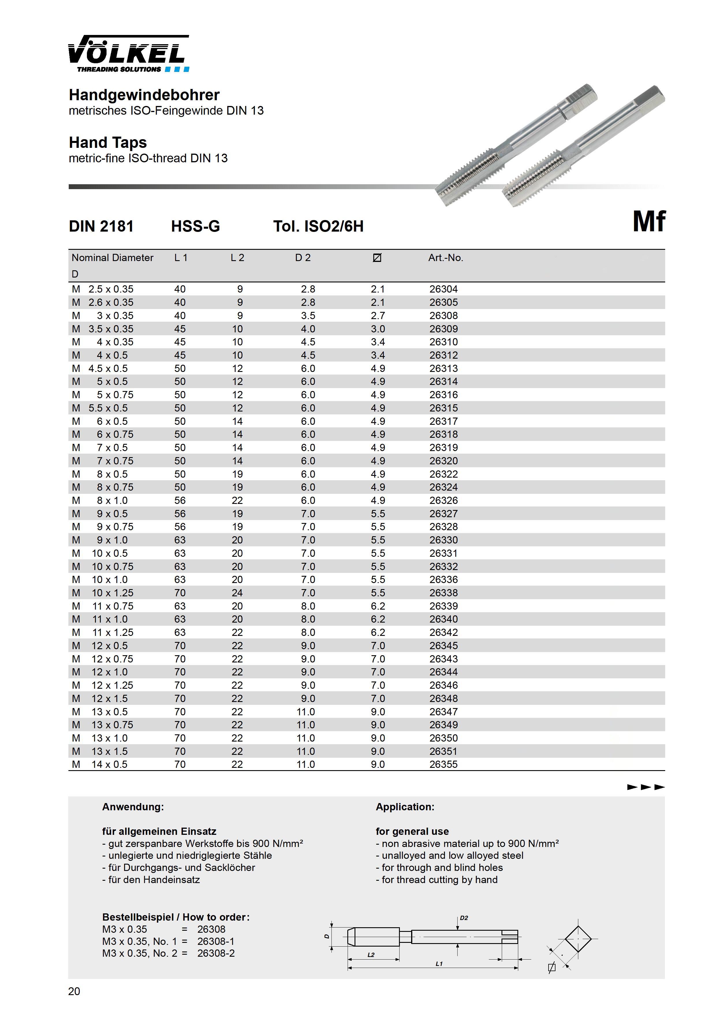 Метчик VOLKEL М12 шаг 0.5мм комплект из 2-х шт. DIN2181 HSS-G 26345 V26345