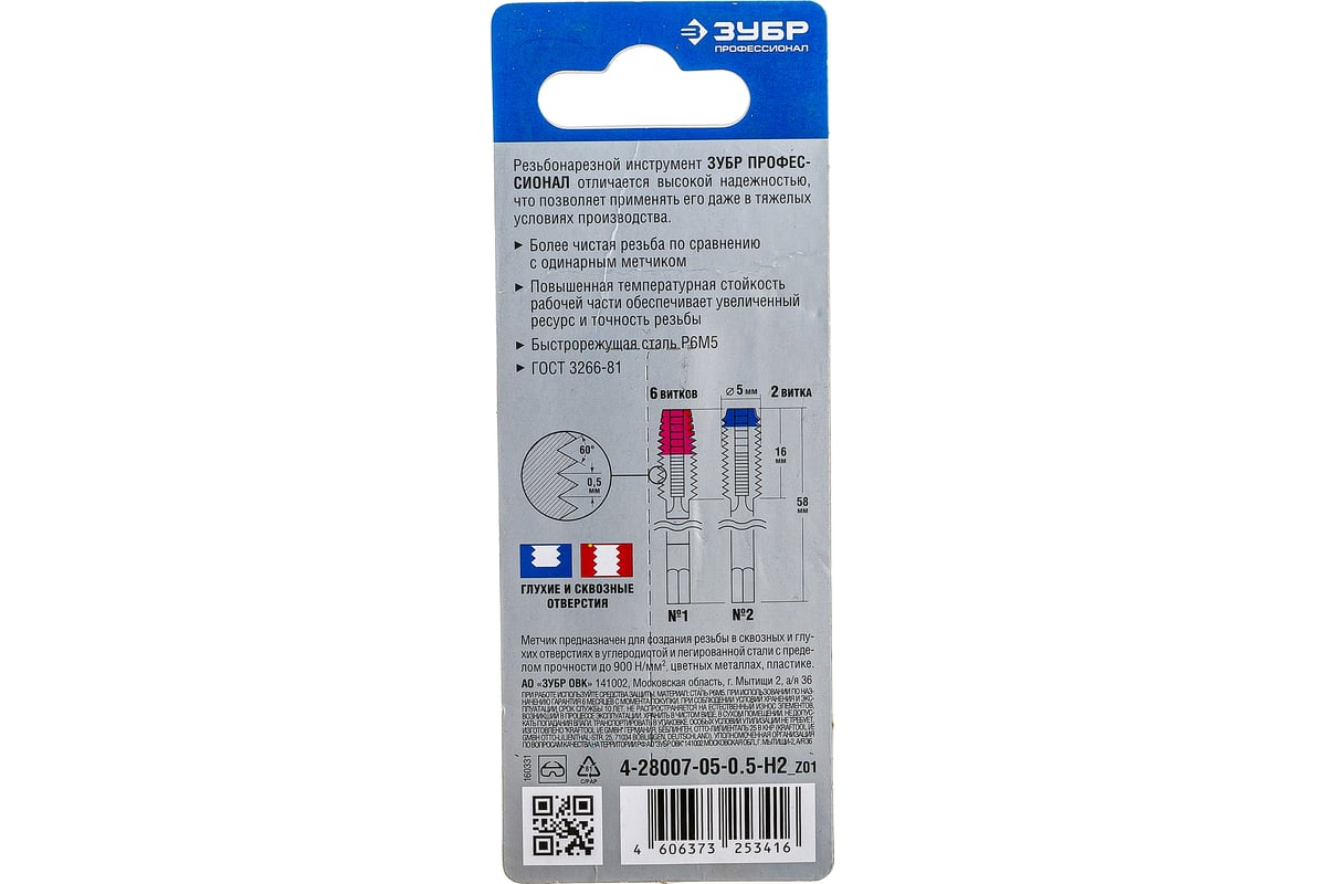 Технические характеристики метчиков ЗУБР 4-28007-05-0.5-H2_z01