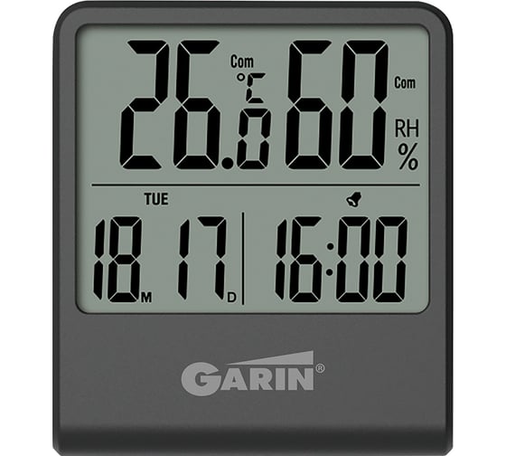 GARIN WS-5 - это цифровой термометр-гигрометр, предназначенный для измерения температуры и относительной влажности воздуха. Помимо основного назначения метеостанция отображает время, дату, а также позволяет установить будильник.