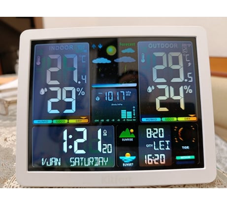 У данного устройства цветной дисплей, на котором хорошо видны все необходимые значения. Устройство подключается к источнику питания с помощью блока питания из комплекта. Метеостанция может работать также от 2 батареек типа AАА (в комплект не входят), благодаря чему ее можно расположить в любом удобном для вас месте.
