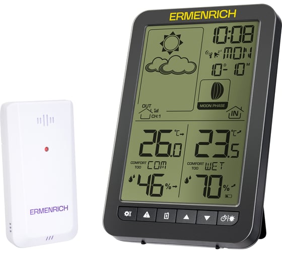 Домашняя метеостанция Ermenrich Report WR20 помогает следить за погодой внутри и снаружи помещения, объединяя в одном приборе термометр, гигрометр, часы, календарь, фазу Луны, прогноз погоды и индикатор уровня комфорта. Устройство фиксирует температуру и влажность, показывает точку росы, отслеживает тенденции и даже предупреждает о риске появления плесени. Это удобная альтернатива постоянным проверкам погоды в приложениях — всё нужное отображается на одном экране.