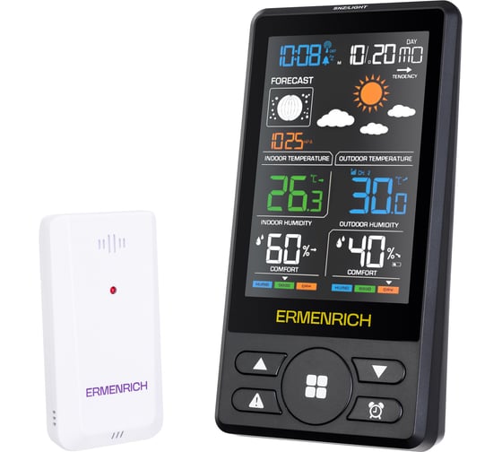 Компактная Ermenrich Report WR50 помогает контролировать микроклимат дома и отслеживать погоду за окном. В комплект входит беспроводной датчик, который можно разместить на стене или заборе на расстоянии до 80 м. Вертикальный экран разделён на удобные блоки с крупным шрифтом: отображаются температура и влажность в комнате и на улице, прогноз погоды, текущая фаза Луны, календарь и время в 12/24-часовом формате. Прибор можно использовать как настольные часы и будильник.