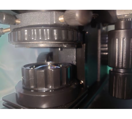 Объективы устанавливаются в револьверное устройство с четырьмя свободными гнездами. Планахроматическая оптика эффективно убирает искажения в картинке, поэтому образцы видны четко, без смазывания мелких деталей и паразитных визуальных артефактов. Револьвер вращается предсказуемо и без усилий. Высокократные объективы – 40х и 100х – имеют защиту передней линзы, что упрощает фокусировку при их использовании. Кроме того, объектив 100х рассчитан на масляную иммерсию – при работе с ним можно использовать этот метод наблюдений. Фокусировка выполняется двумя рукоятками грубой и тонкой настройки, они расположены коаксиально с двух сторон штатива. Предметный столик имеет классическое исполнение – перемещается по двум осям, дополнен препаратоводителем.