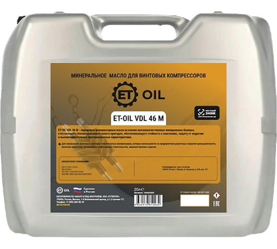 ET-OIL VDL 46 — современное компрессорное масло произведённое на основе высококачественных минеральных базовых масел I группы и беззольного инновационного пакета присадок.