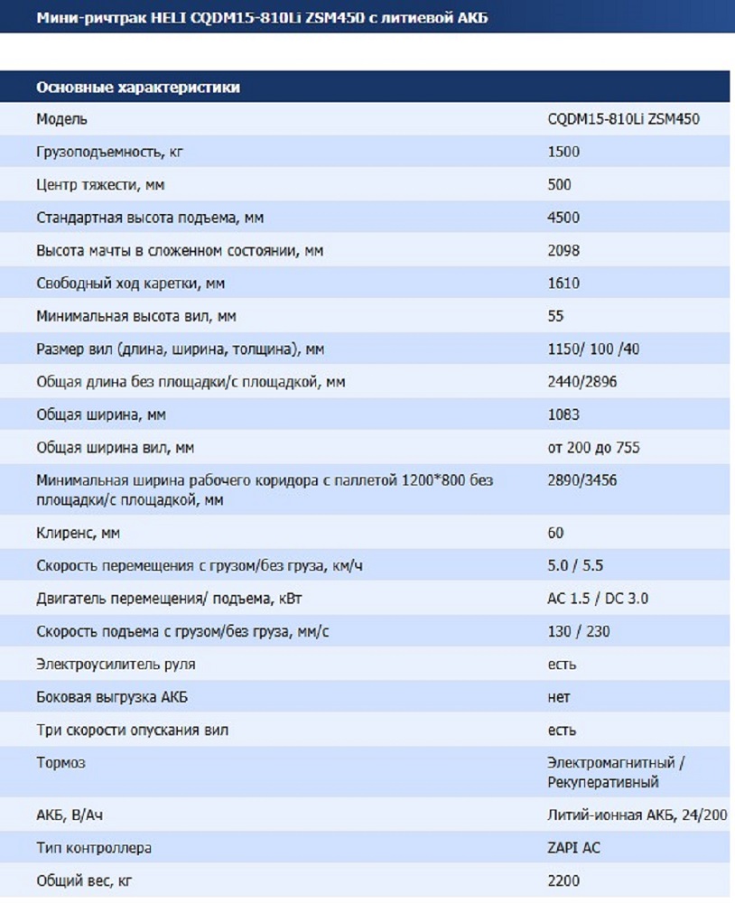 Мини-ричтрак HELI CQDM15-810Li ZSM450 - небольшой ричтрак, схожий по внешнему виду и габаритом с самоходным штабелером. Он оснащен функцией наклона вил и предназначен для интенсивных погрузо-разгрузочных работ.