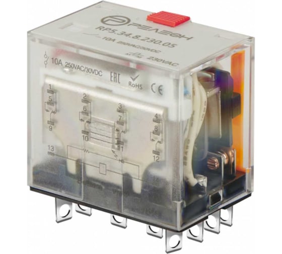 Миниатюрное силовое реле RP5.34.8.230.05, 4 перекидных контакта 10А (230В AC) блокируемая кнопка проверки, светодиод. Это реле устанавливается на розетку. Миниатюрное силовое реле РЕЛЕОН используется для управления освещением и другими устройствами коммерческого, гражданского и промышленного назначения. Благодаря своей универсальности и простоте установки, оно станет незаменимым компонентом в вашей системе управления энергопотреблением и систем АСУ.