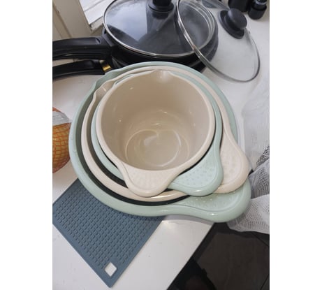 Многофунциональные миски и для теста подходят и картошку очищенную в них храню. На столе занимают мало места. Хороший пластик.