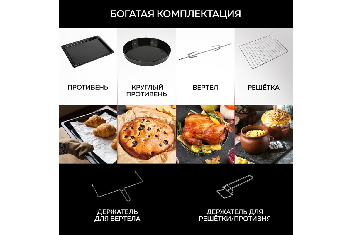 Мини-духовка электрическая снабжена функцией конвекции, а также вертелом, которые можно использовать как по отдельности, так и совместно, что позволит равномерно пропечь объемные блюда со всех сторон и обеспечит хрустящую корочку. Печь настольная имеет размеры 622*427*385 мми вес 11,1 кг, что позволит разместить ее в любом удобном месте.