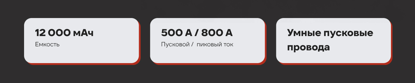 Хватает на 3-4 запуска малолитражных (до двух литров бензин) авто в морозы -24 Короткие провода, но ровно на те машины которые может запустить(где пусковой ток 400-600). Бмв 4.4 не прокрутилось, даже с ожиданием после подключения. Gl дизель 3.5 усадил в ноль с 90% за две попытки по 10 секунд